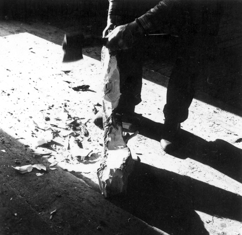 Neg nr 243, Bakknaften. täljning med yxa av knaftämnets insida. Foto 16.8 1962.