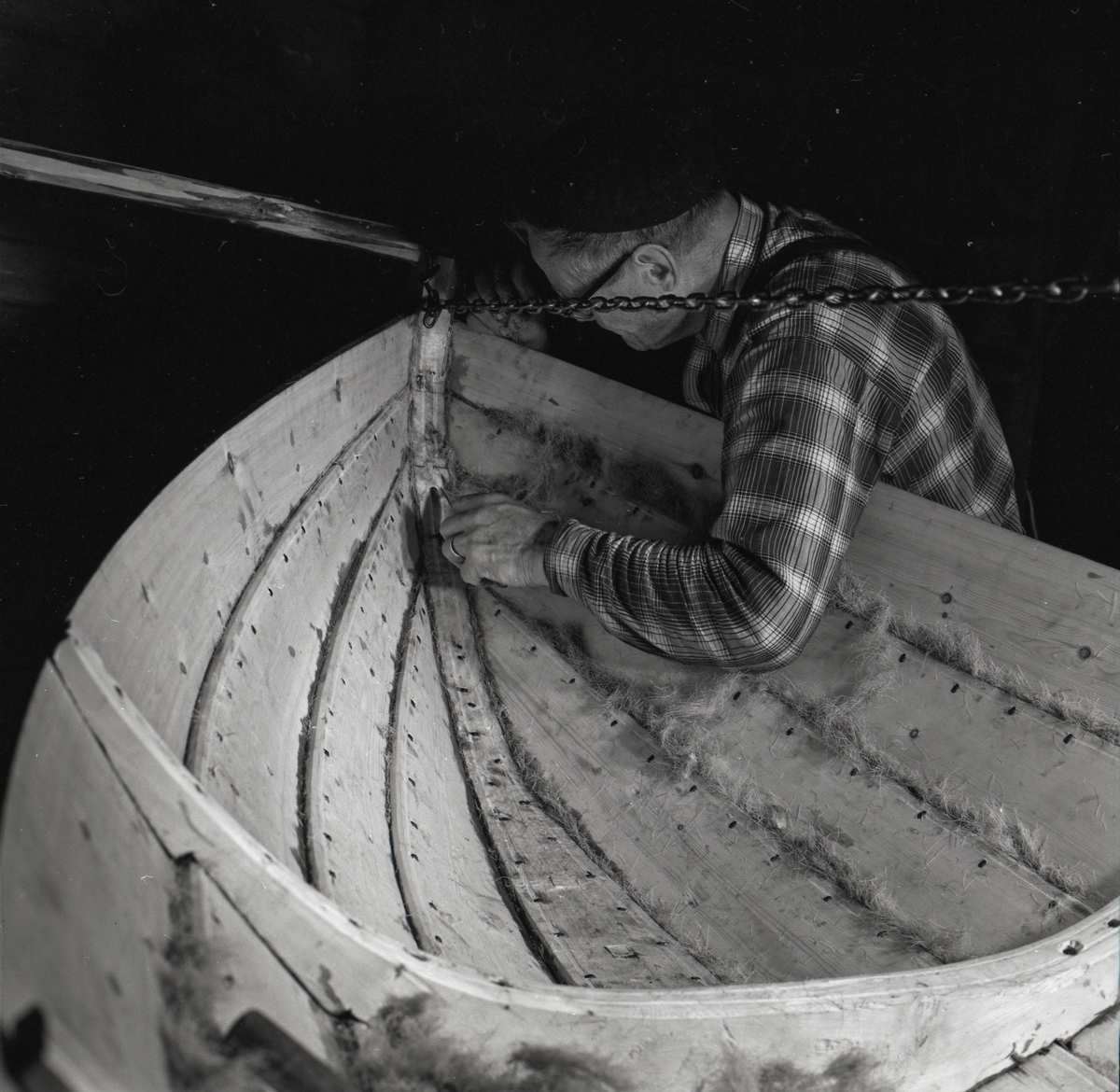 Neg nr 247, Överflödigt renhår skäres bort i bordfogarna. Foto 17.8 1962.