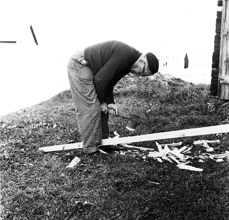 Neg nr 258, Relingslisten täljes med yxa ur en plankka. Foto 18.8 (1962).