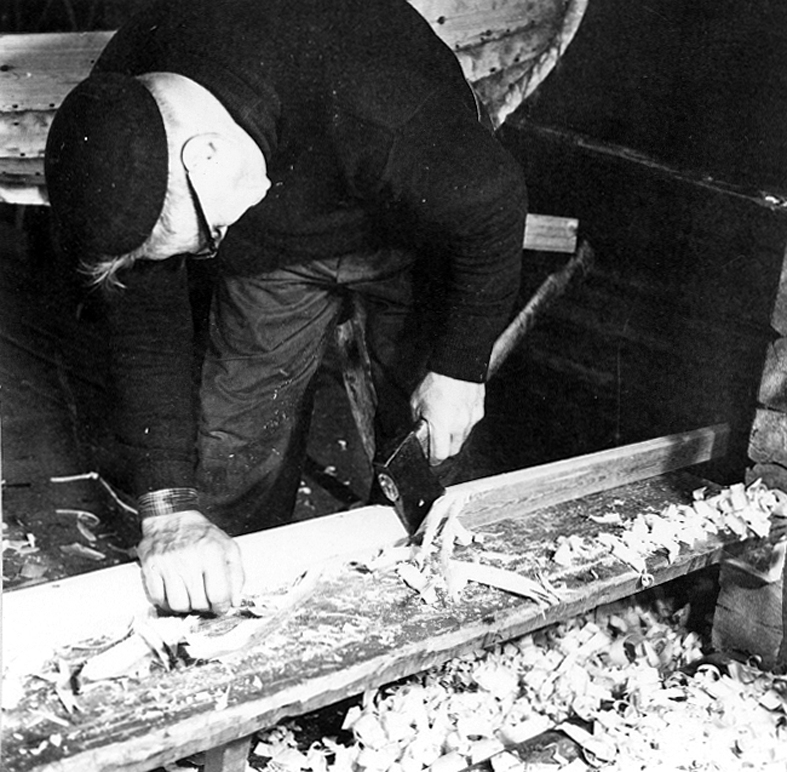 Neg nr 260, Relingslistens snedfasning täljes på hyvelsätet med yxa. Foto 18.8 (1962).