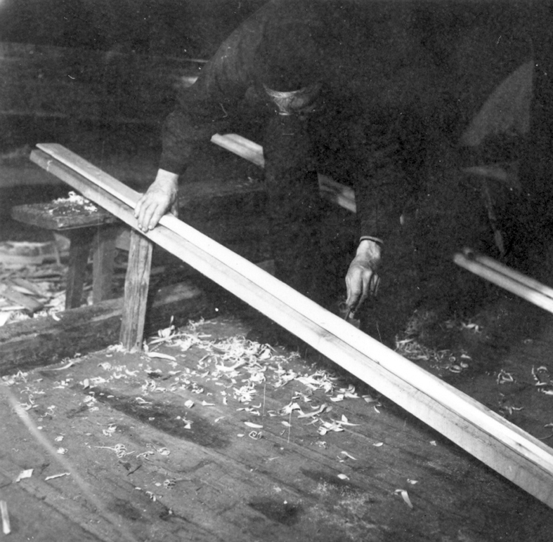 Neg nr 296, En färdig åra lägges för avritning på den till åra ämnade brädan. Foto 23.8 1962.