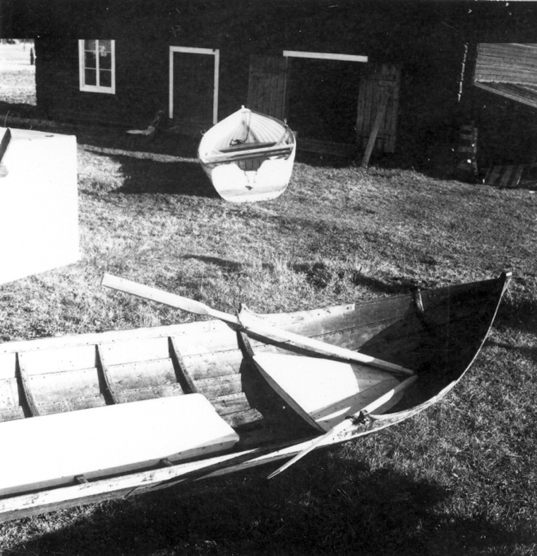 Neg nr 317, Den färdiga båtens förskepp med åror, framskott och långskott. Foto 7.10 1962.