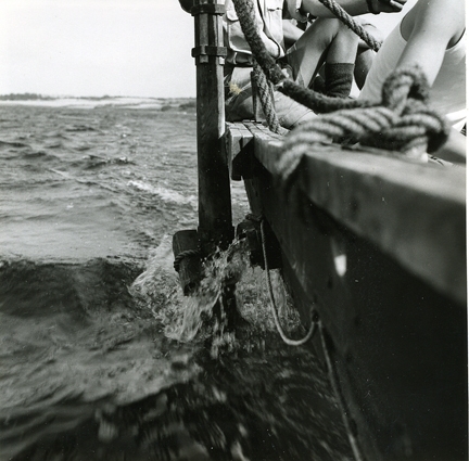 Detalj av rodret, som ätr en kopia av Vorså-rodret. Imme Gram under segling i Lilla Bält.