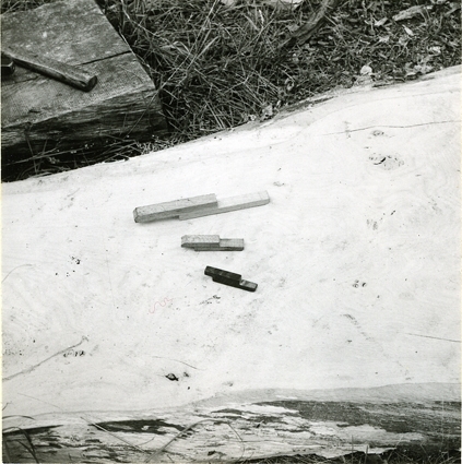 tre strykmått, "köer" (plur. en kö), av trä. se uppt. klinkbyggnad. Christian Madsens båtbyggeri. Foto N(ils) Nilsson aug (19)64. Danmark, Själland, Lynaes.