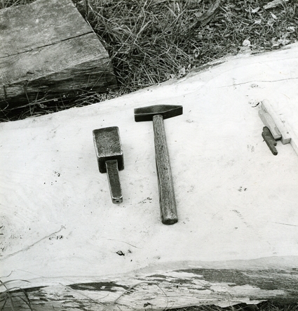 Verktyg för klinkning. Hammare och järn att hålla emot med. Obs. det lilla hålet i järnets ända, avsett till att slå klinknagelns nerstukning slät och rund. Christian Madsens båtbyggeri. Foto N(ils) Nilsson aug (19)64. Danmark, Själland, Lynaes.