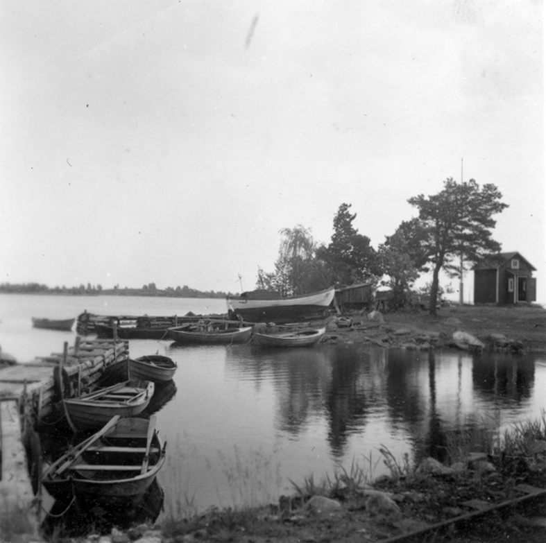 Småland. Kalmar län, Stranda härad, Döderhults socken, Påskallavik. Lotsutkiken med slipen från NO. Tv skeppare Nilssons brygga och båtar.