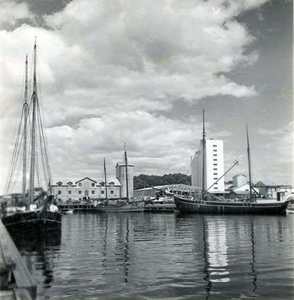 Öland, Borgholm. Parti av hamnen med spannmålssilo och motorseglare.