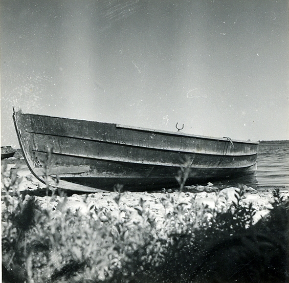 Skötbåt av äldre typ med täljda naturvuxna kinningar och vinningar samt uppstigande stävar.