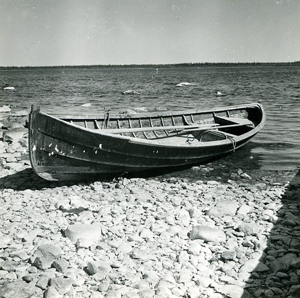 Skötbåt av äldre typ med täljda naturvuxna kinningar och vinningar samt uppstigande stävar.