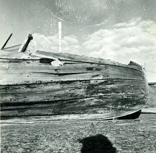 Titel: Sönderbråkad skötbåt med täljda vinningar, byggd före 1900.