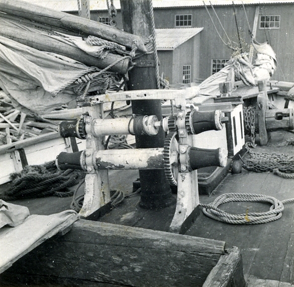 Galeasen Förlig Vind. Däcksbild med stormast, spel och kajutkapp.