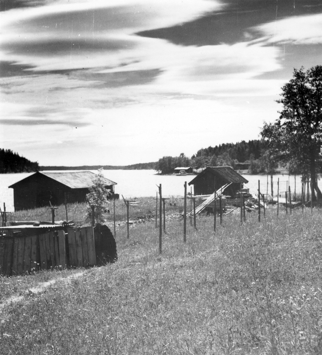 Uppland, Stockholms län, Frötuna skeppslag, Länna socken, Vettershaga. Skeppare Olssons sjöbodar och gisthage. Foto i juni 1950.