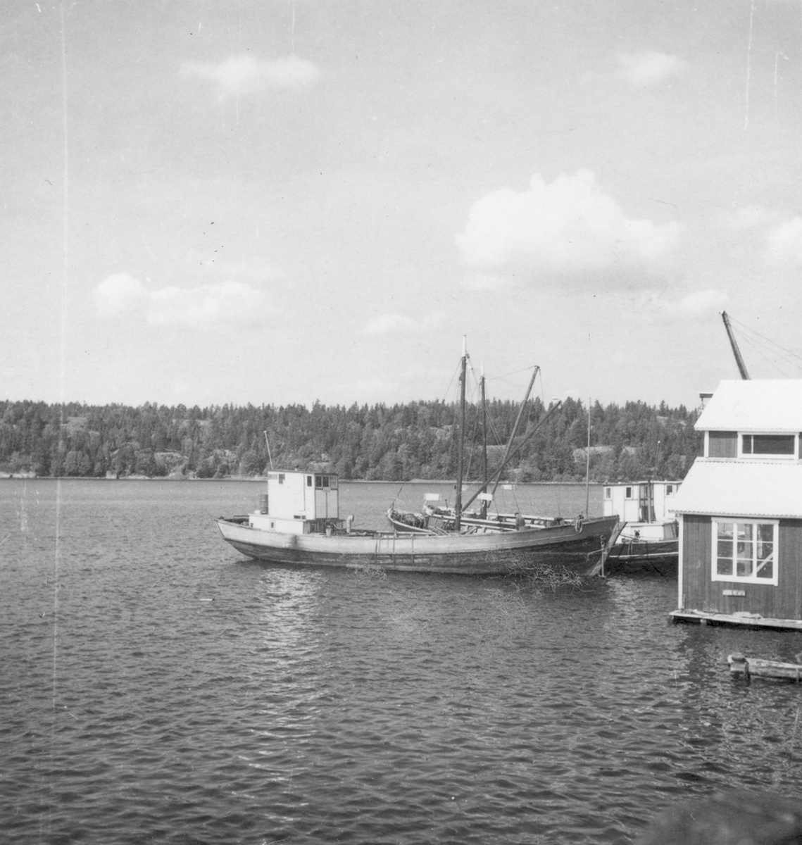 Uppland, Stockholms län, Frötuna skeppslag, Länna socken, Bergshamra. Vedjakter ligger på törn vid slipen till varvet. juni 1950