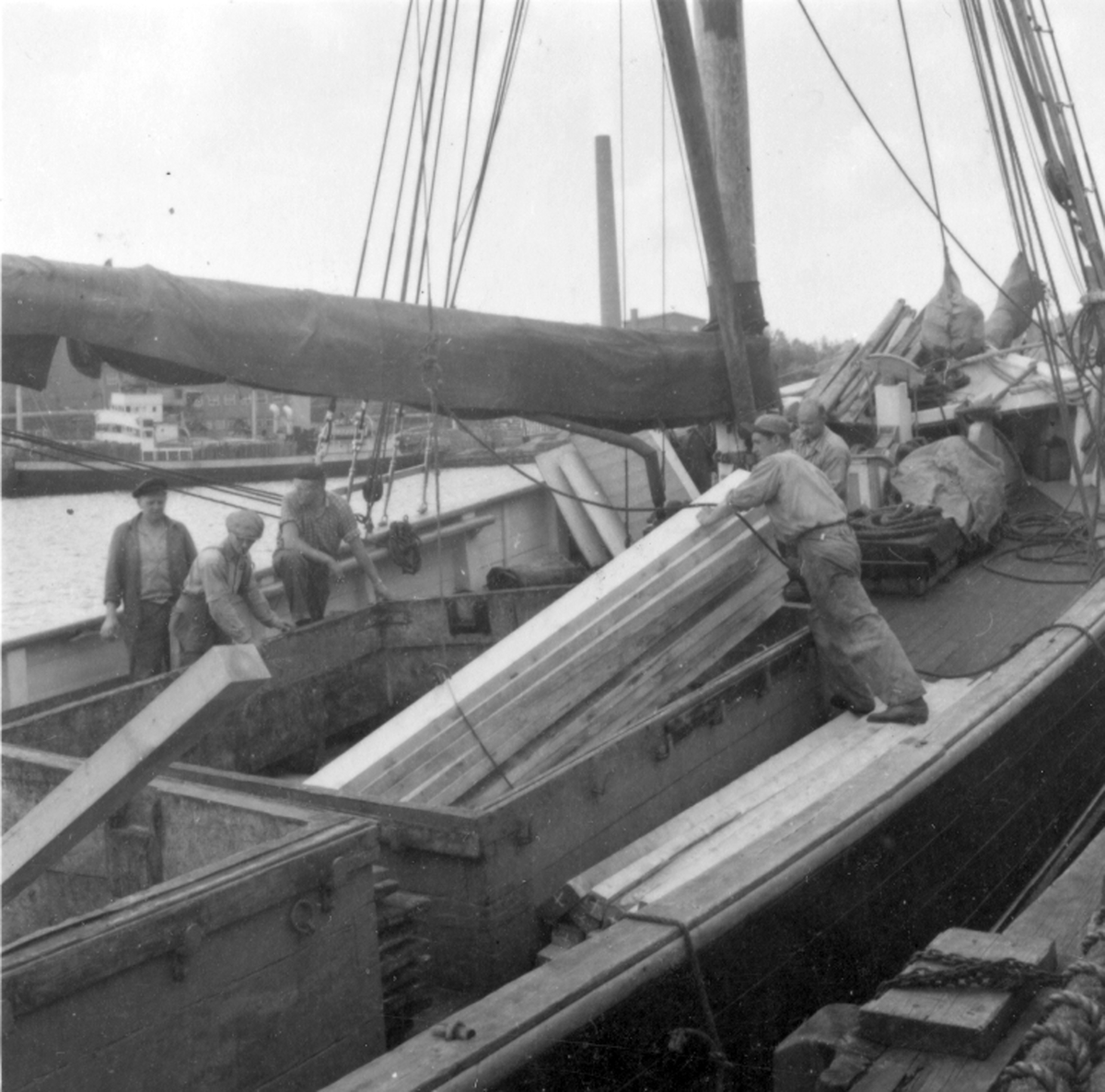 Motorgaleasen Tove-Lise från egersund lastar plank.