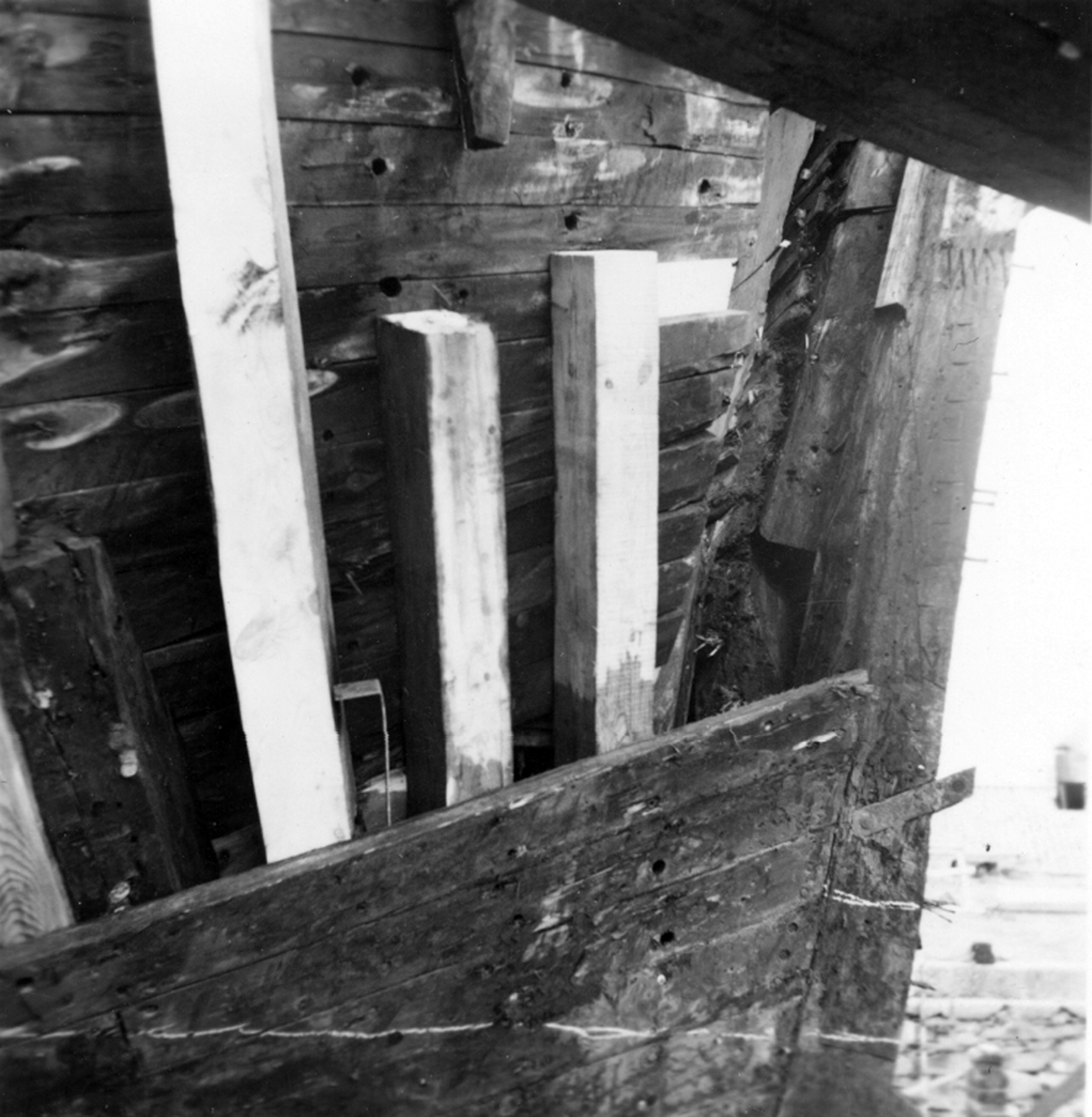 M/S Don Carlos från Säffle. Bordläggningen i styrbords bog har borttagits. nya spant håller på att sättas in. Aug 1954