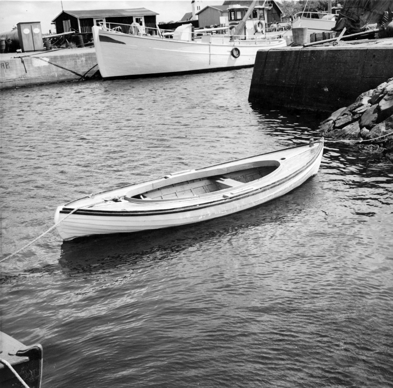 Skåne, Torekov, yttre hamnen, liten kanotartad snipa. I bakgrunden en trålare, som passagerarbåt för Väderötrafiken. Juni 1962