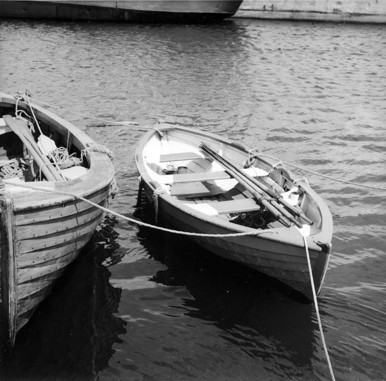 Skåne, Torekov, Yttre hamnen, Brygga för småbåtar med skånesnipor och en plattbottning. Juni 1962