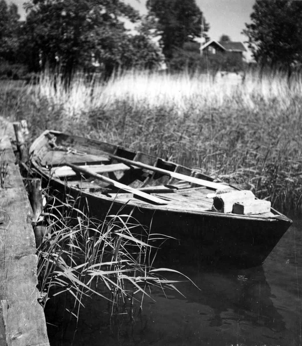 Uppland, Stockholms län, Frötuna skeppslag, Länna socken, Bergshamra brygga. Peter Erikssons roddsump. Snipa med fisksump i aktern. juni 1950