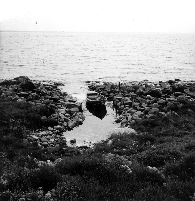 Skåne, Kristianstads län. Barkåkra socken, Skepparkroken. Kås med blekingseka, i bakgrunden ett bottengarn-