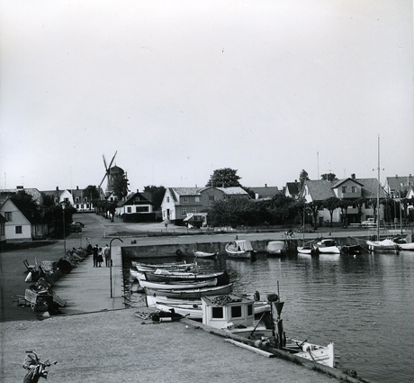 Hamnen. Utsikt över hamnen från västra hamnarmen. Th varvets utrustningskaj på pålar. därinnanför slipen och bakom vinschhuset skymtar byggskjulets tak. Skåne, Malmöhus län, Viken.