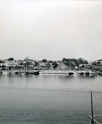 Hamnen. Utsikt över hamnen från västra hamnarmen. Th varvets utrustningskaj på pålar. därinnanför slipen och bakom vinschhuset skymtar byggskjulets tak. Skåne, Malmöhus län, Viken.
