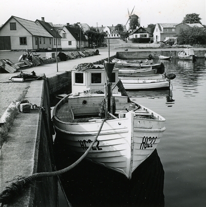 Västra hamnarmen sedd mot norr. Däcksbåt, möjligen byggd i Blekinge. Skåne, Malmöhus län, Viken.