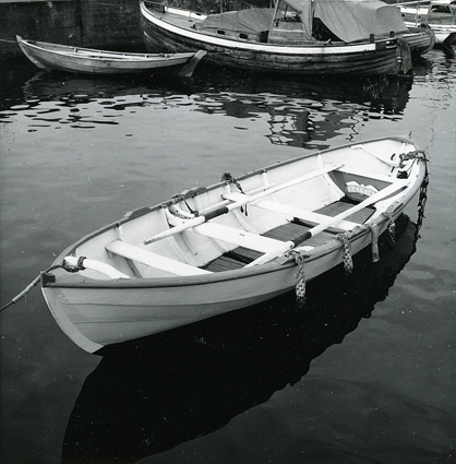 Hardangersnipa vid västra hamnarmen. I bakgrunden en däcksbåt, ombyggd till lustbåt samt en blekingseka. Skåne, Malmöhus län, Viken.