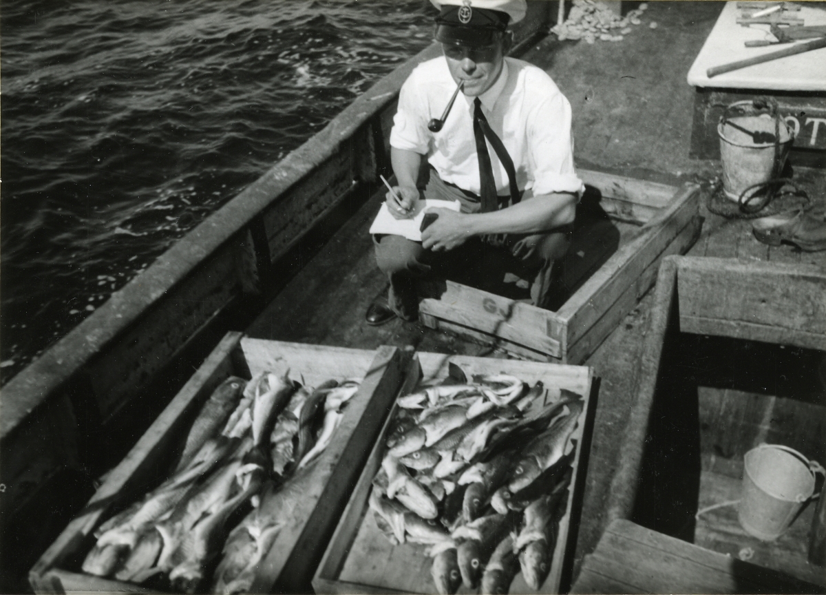 Göteborgs Örlogsdepå. Proviantupphandling till sjöss. En mötande fiskekutter erbjuder nyfångad fisk, uppbördsstyrman beger sig över till kuttern, sedan denna bordat vedettbåten. Han ses här göra upp räkenskaperna.