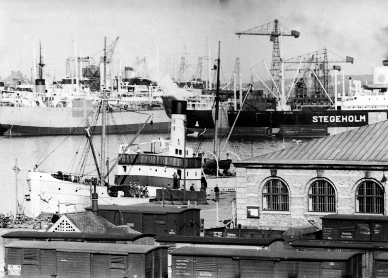 Fil lic. gunnar Jonssons undersökningsresa till Västkusten juni 1940. 3. Göteborgs hamn juni 1940. I förgrunden till höger Tullhuset. I bakgrunden Götaverken med fartyg liggande för reparation och utrustning.