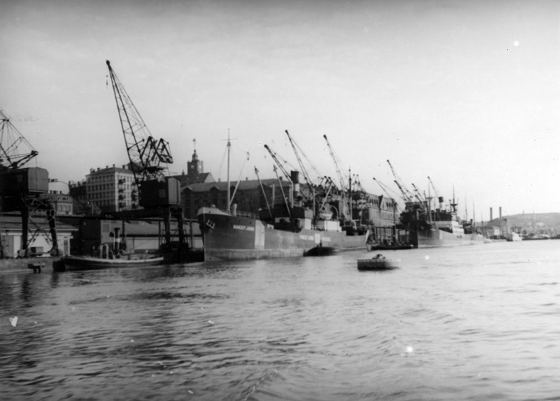 Fil lic. gunnar Jonssons undersökningsresa till Västkusten juni 1940. 30. Göteborgs hamn juni 1940.Packhuskajen från älvsidan.