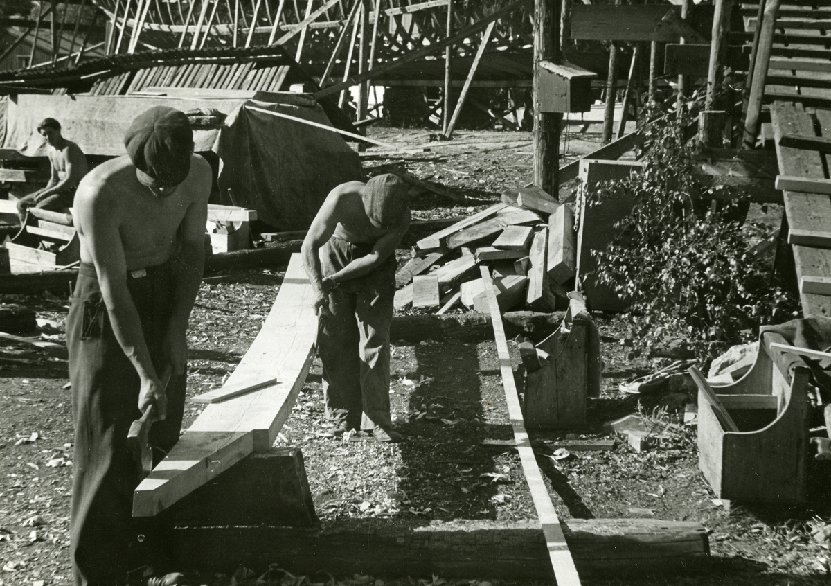 "Bjälkväggen" (balkvägarna) "lagas till". Kanterna på "bjälkvägen" mallhuggas.