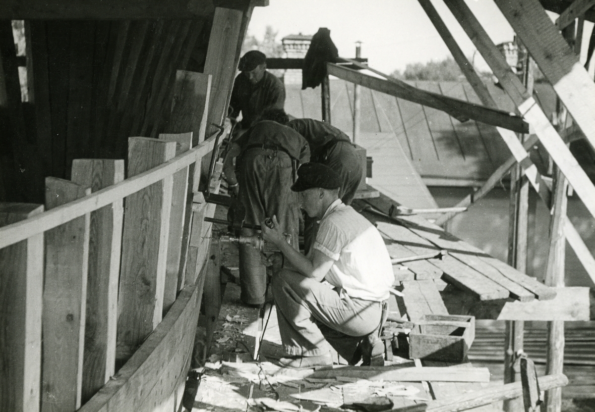 "Sätta till bordvägsgång" på backen till Isländskt fiskefartyg under byggnad. Bordplankan borras för spikningen.