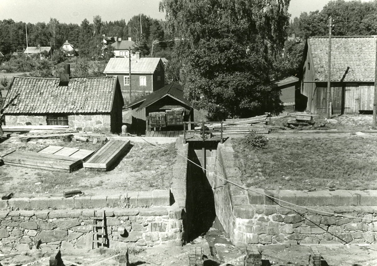 Avloppet till torrdockan, byggd 1820. T.v i bakgrunden gamla baskistan och smedjan, numera ej använda.
