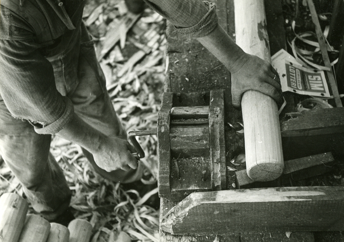 Tillverkning av frihultar hos slussvakten Bertil Frigren, Sjötorp, sluss I. Hålet borras i detta fall med en äldre typ av novare.
