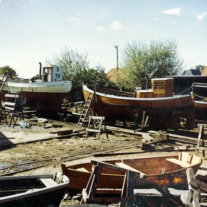 Slipen. I förgrunden prammar. Vibro Jenssens båtbyggeri. Danmark, Sjaelland, Köge.