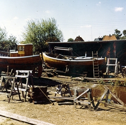 Slipen. I förgrunden prammar. Vibro Jenssens båtbyggeri. Danmark, Sjaelland, Köge.