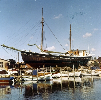 Motorgaleas på slip. Vibro Jenssens båtbyggeri. Danmark, Sjaelland, Köge.
