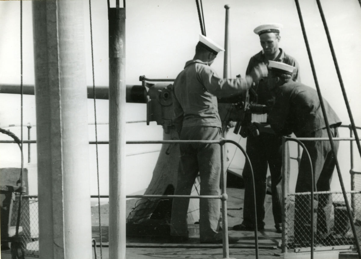 Göteborgs Örlogsdepå. H.M. Hjvb 384:s resa. Exercis med fartygets 57 mm:s kanon M/89 B.