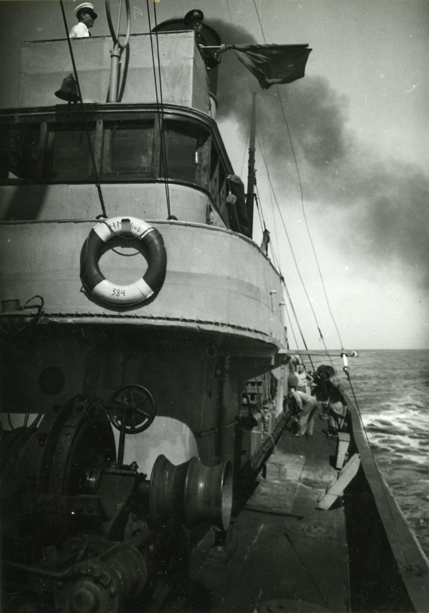 Göteborgs Örlogsdepå. H.M. Hjvb 384. Fartygschefen och uppbördsstyrman på övre bryggan ha just mottagit ett signalmeddelande från en kustsignalstation.