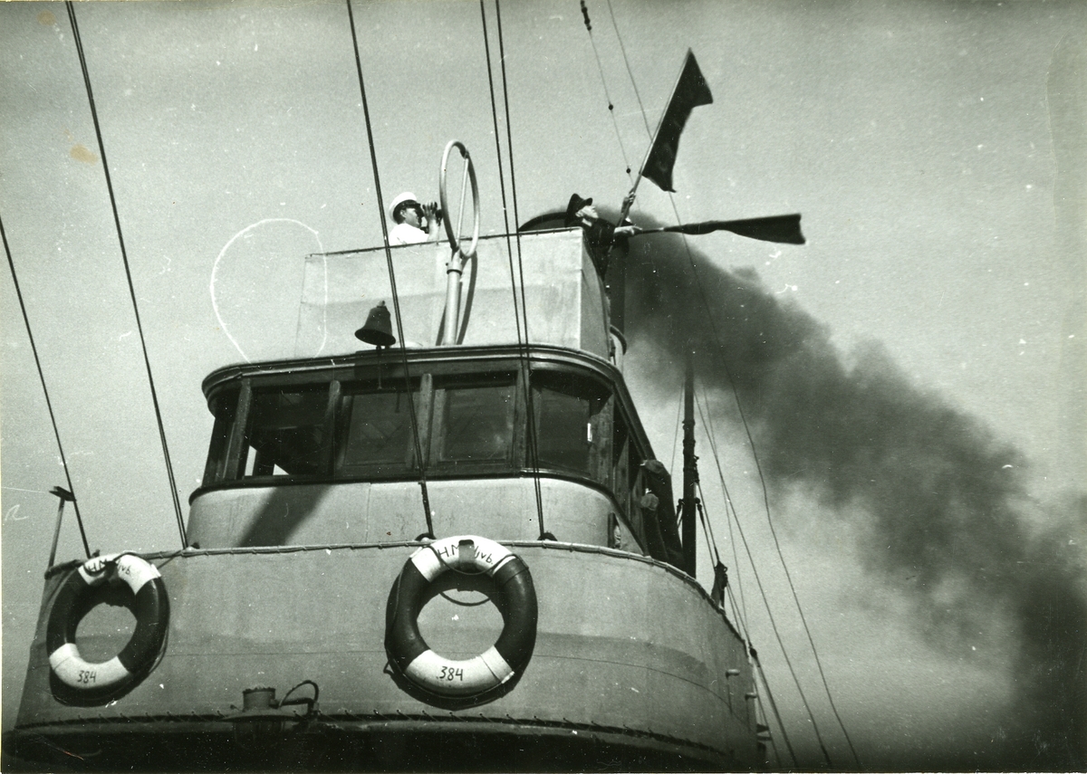 Göteborgs Örlogsdepå. H.M. Hjvb 384. Fartyget passerar en kustsignalstation, och meddelanden växlas medels signalering med semaforflaggor. Fartygschefen själv sköter tillfälligt signaleringen medan hans närmaste man avläser svarssignalerna med kikare.