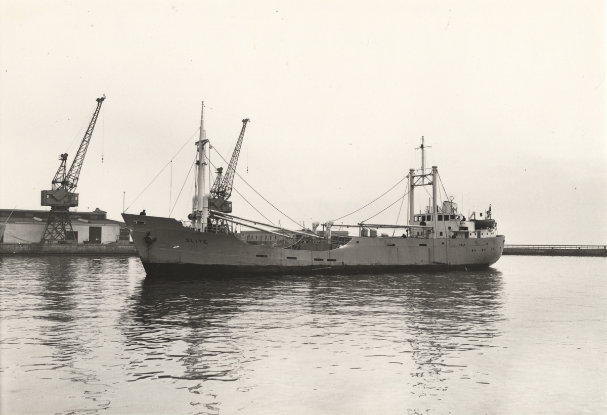 Foto i svartvitt visande lastmotorfartyget "SLITE" i Köpenhamn under år 1956.