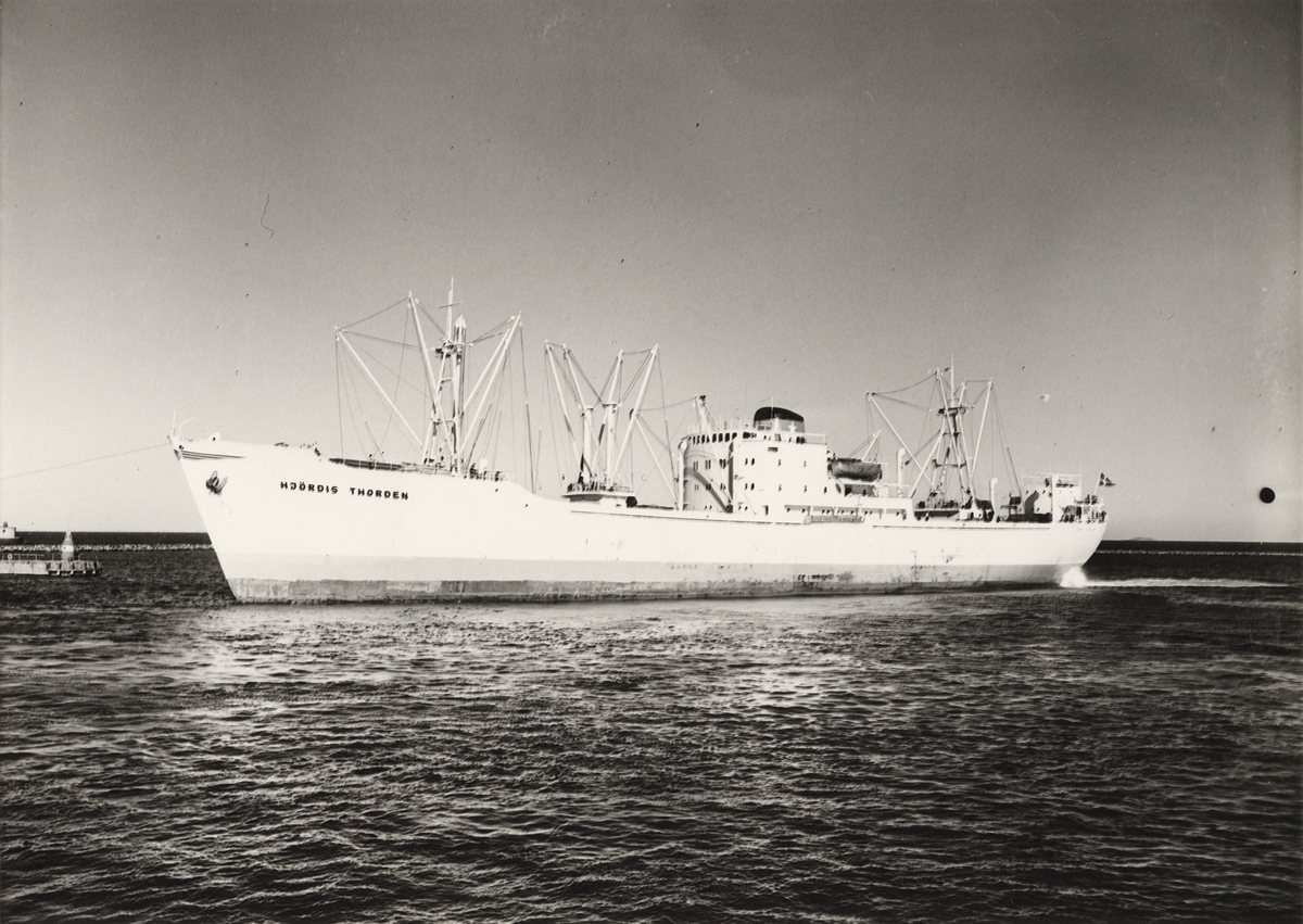 Foto i svartvitt visande lastmotorfartyget "HJÖRDIS THORDÉN" i Köpenhamn någon gång under åren 1955 - 1956.