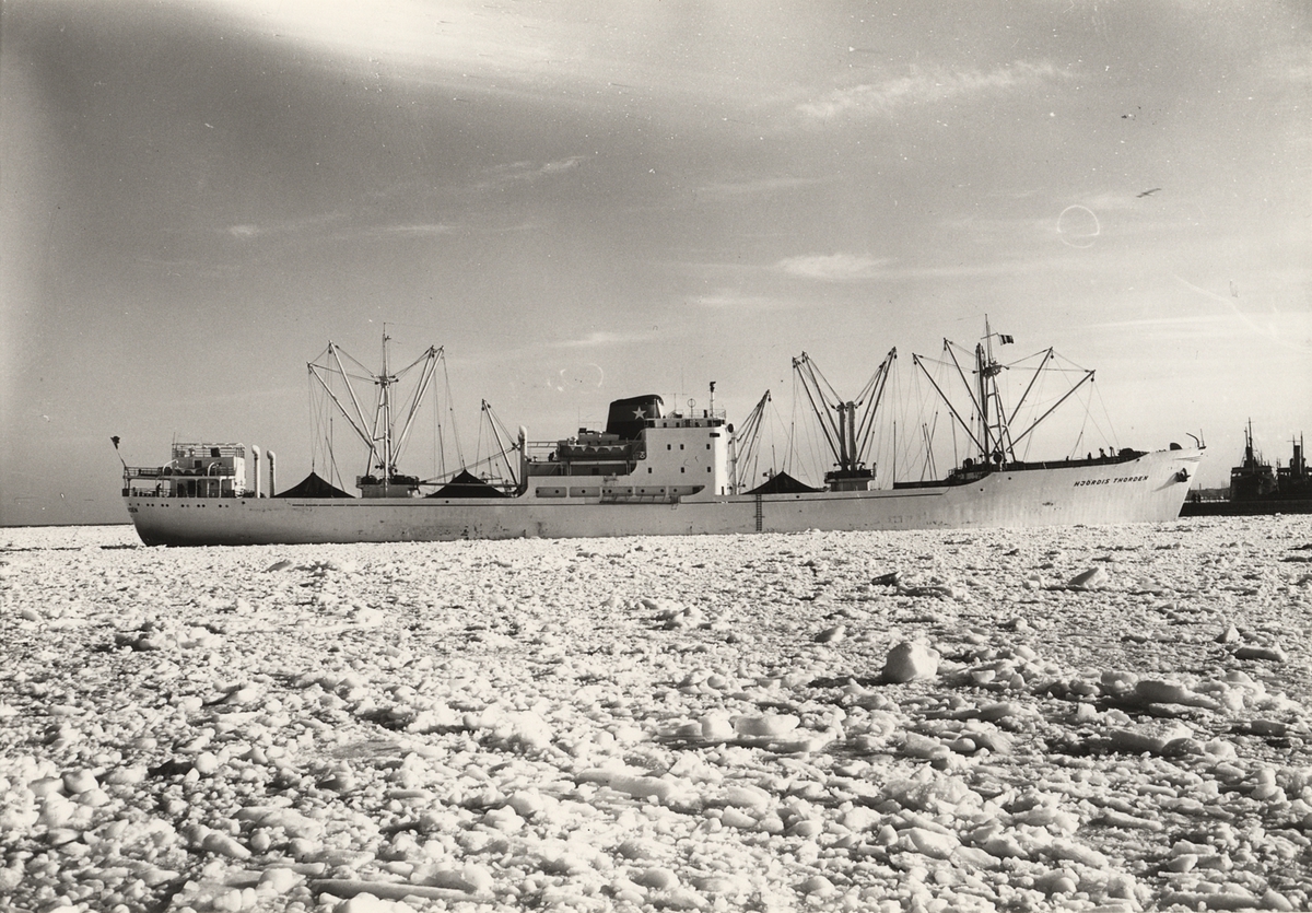 Foto i svartvitt visande lastmotorfartyget "HJÖRDIS THORDÉN" i Köpenhamn någon gång under åren 1955 - 1956.