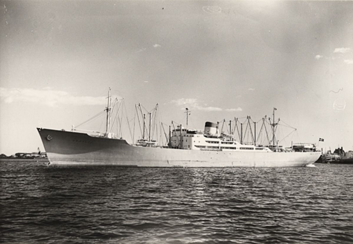 Foto i svartvitt visande lastmotorfartyget "CUMULUS" i Köpenhamn under år 1957.