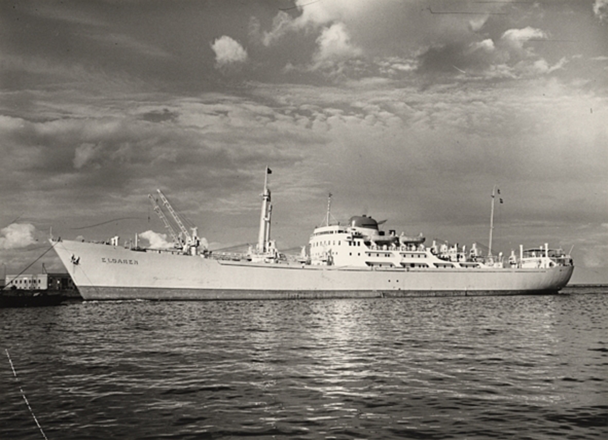 Titel: Foto i svartvitt visande lastmotorfartyget "ELGAREN" taget i Köpenhamn under år 1957.