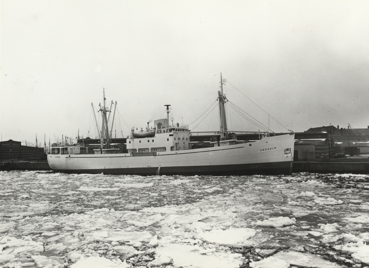 Foto i svartvitt visande lastmotorfartyget "VAXHOLM" taget i Köpenhamn under år 1956.