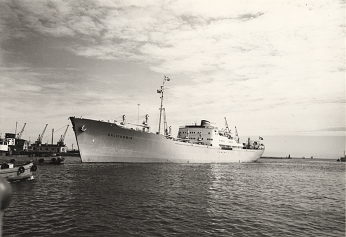 Titel: Foto i svartvitt visande lastmotorfartyget "CALIFORNIA" i Köpenhamn den 8.5.1956.