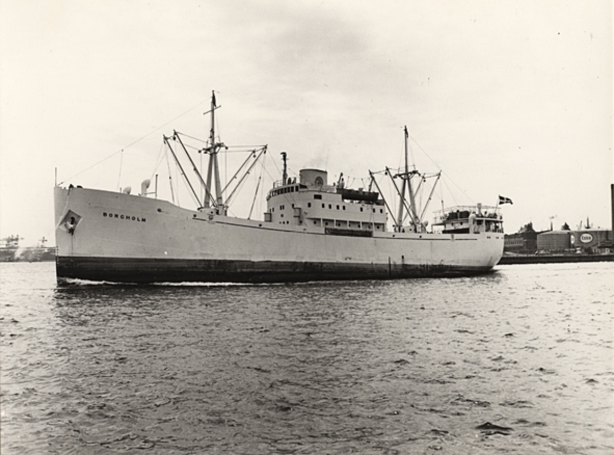 Foto i svartvitt visande lastmotorfartyget "BORGHOLM" i Köpenhamn den 12.5.1956.