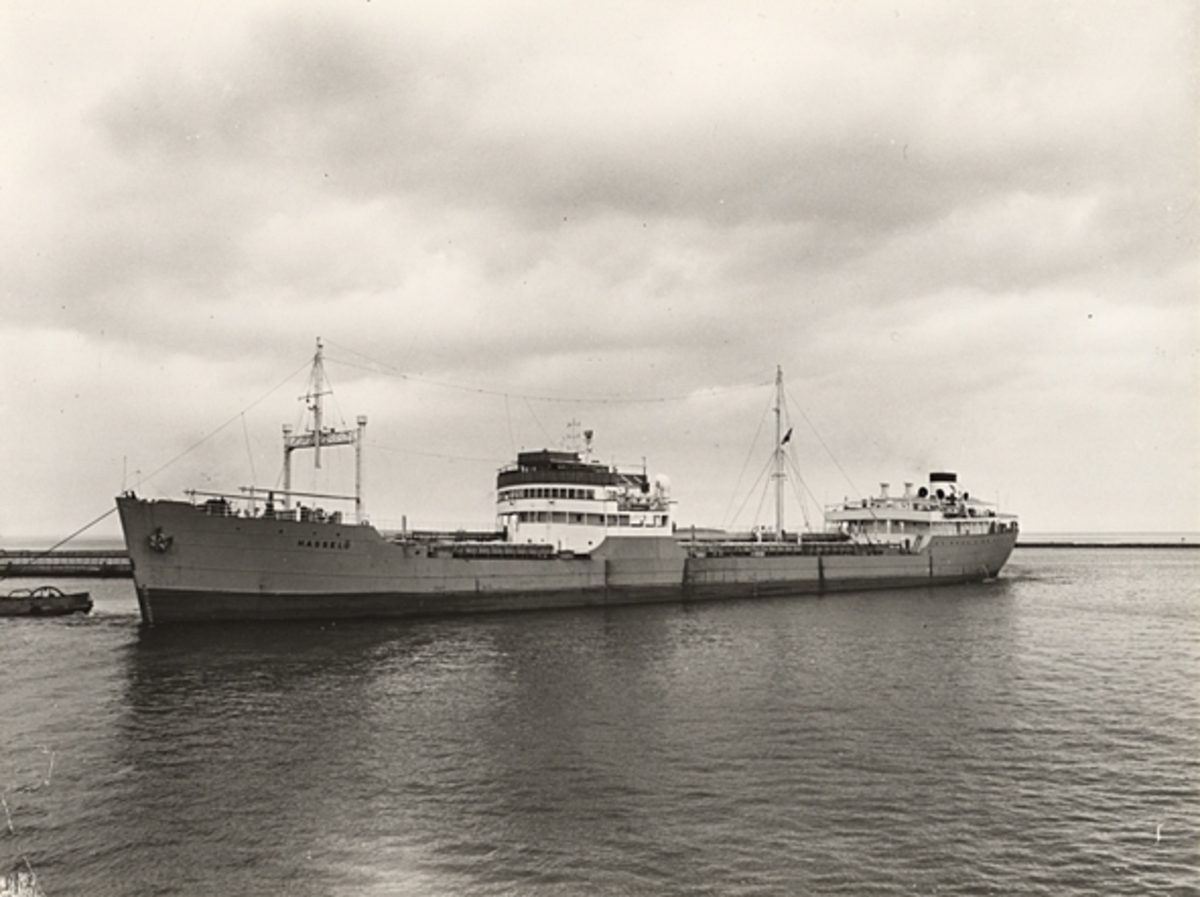 Foto i svartvitt visande tankmotorfartyget "HASSELÖ" i Köpenhamn i mars månad 1956.