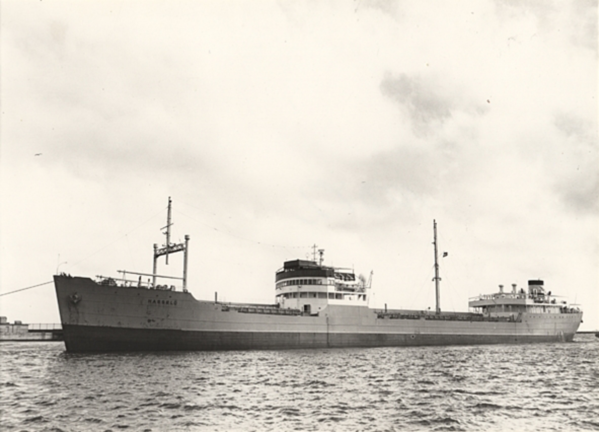 Foto i svartvitt visande tankmotorfartyget "HASSELÖ" i Köpenhamn i mars månad 1956.